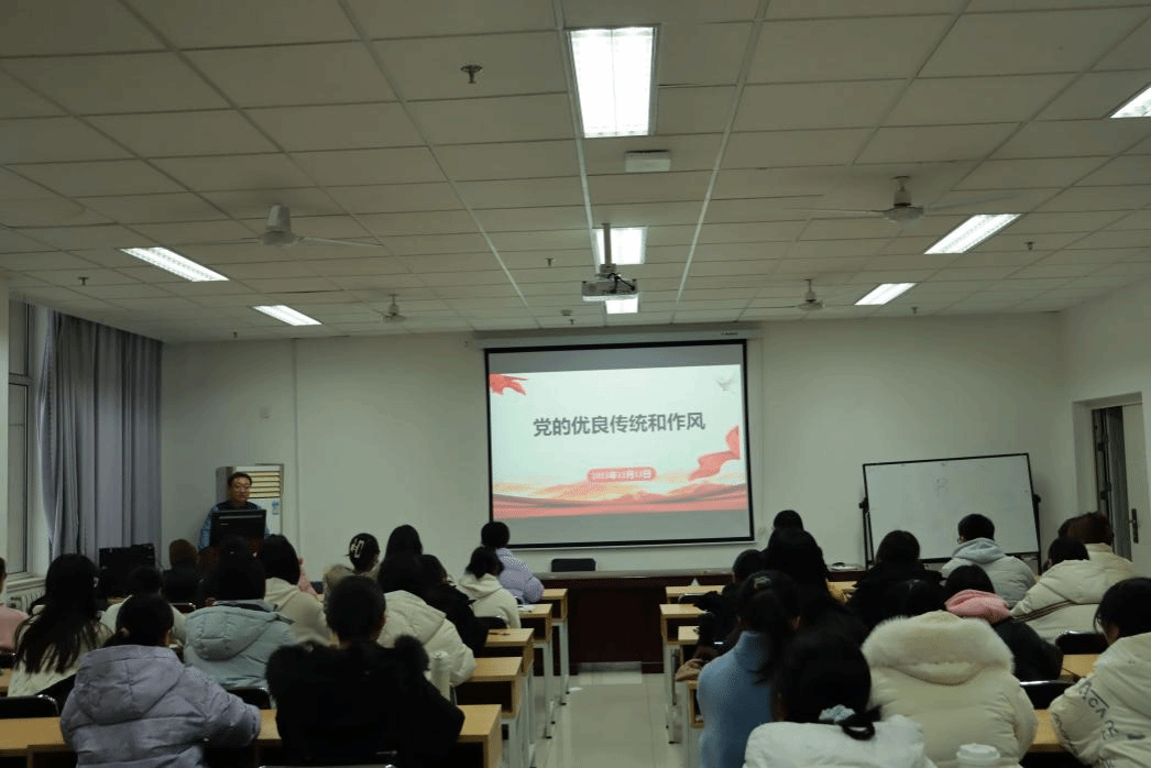 史国普书记以“党的优良传统和作风”为主题,为大家详细解读了党的优良传统和作风的形成与内涵、继承和发扬党的优良传统和作风的时代意义,以及入党的大学生如何继承和发展党的优良传统和作风。他指出,中国共产党是有着光荣传统和优良作风的马克思主义政党,党在长期革命实践中形成了实事求是、艰苦奋斗等优良传统和理论联系实际、密切联系群众、批评和自我批评等优良作风。他还通过将理论宣讲与案例分析相结合,引导大家思考,大学生只有继承和发扬好党的优良传统和作风,思想才能不断进步,工作水平和能力才能不断提高,更好地实现人生理想目标。最后,史国普书记寄语同学们做到“四个要”。一要充分认识继承和发扬党的优良传统和作风的重要性和必要性;二要认真学习领会党和国家领导关于党的优良传统和作风的论述;三要学习先烈以及英雄模范人物先进事迹;四要加强党性修养,以自身良好形象来实践和宣传党的优良传统和作风。