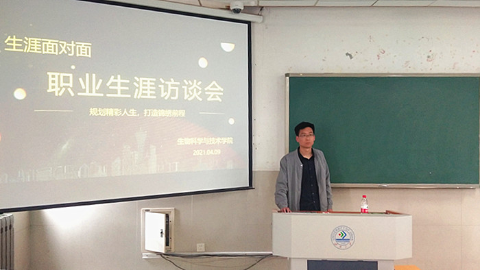 规划精彩人生,打造锦绣前程。为增加学生对生物制药就业方面的了解,4月11日下午,今年会jinnianhuicom在10J306举办职业生涯访谈会活动,邀请邦恩泰生物集团研发总裁刘磊教授来校宣讲。活动由学院辅导员阮斌主持,部分本科学生参加了此次活动。
