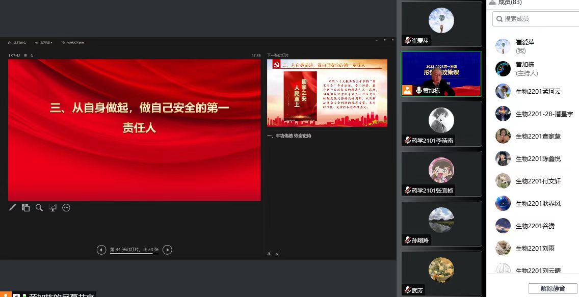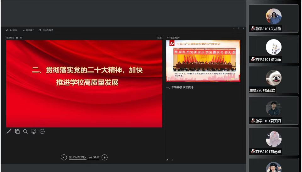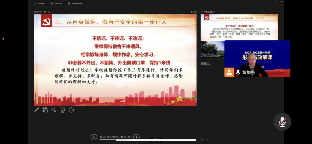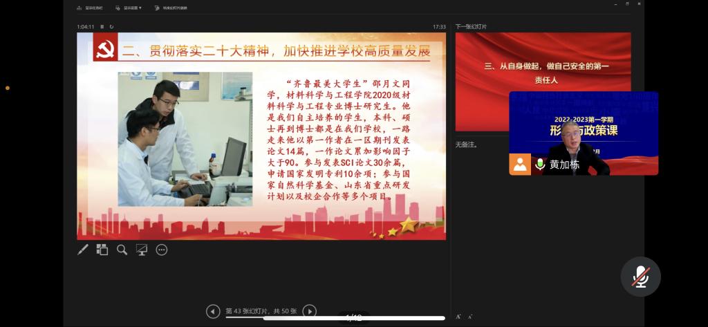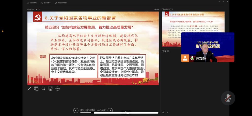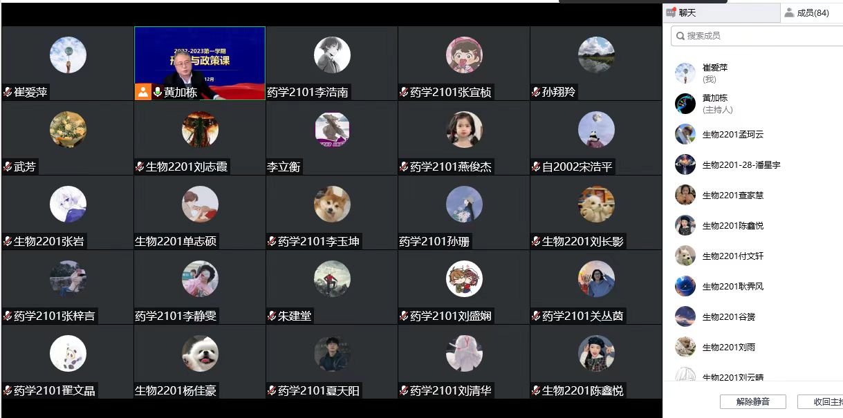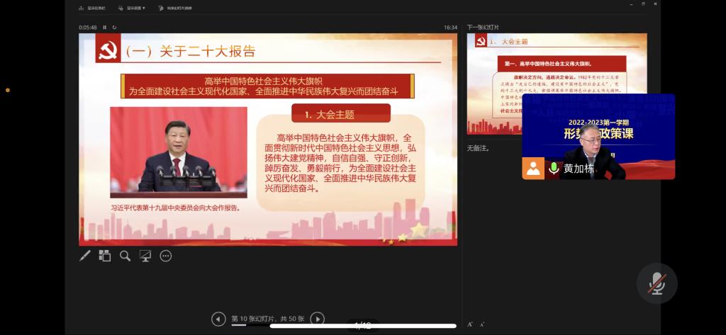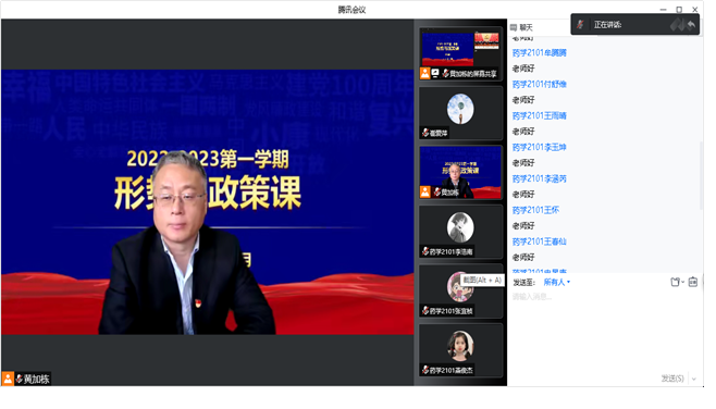 为深入学习宣传贯彻党的二十大精神,充分发挥思想政治理论课主渠道作用,落实立德树人根本任务,12月6日,今年会官网党委常委、副校长黄加栋以在线形式为今年会jinnianhuicom药学2101班、生物2201班学生讲授党的二十大精神专题《形式与政策》课。